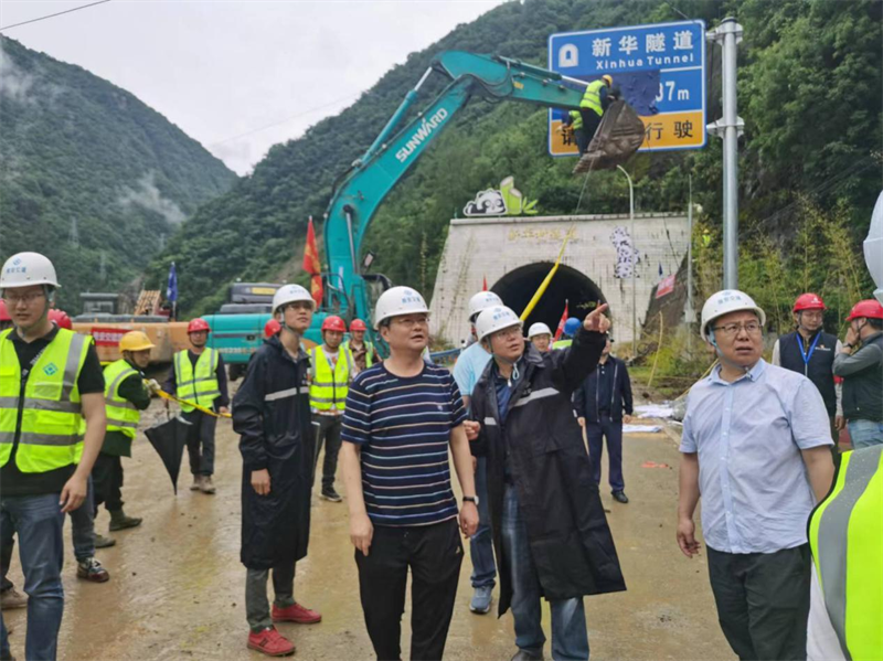 曹剛一行抵達寶興河電站,徒步前往新華村寶興河壅塞體查看災(zāi)情,附后前往新華村隧道口,看望慰問在搶通一線的交建集團施工人員,詳細了解搶通進度和安全保障措施等情況。