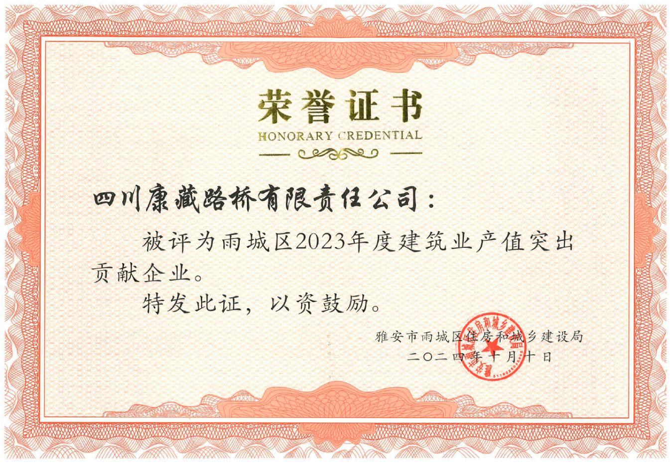 今年10月,路橋公司被雅安市雨城區(qū)住房和城鄉(xiāng)建設(shè)局評為“雨城區(qū)2023年度建筑業(yè)產(chǎn)值突出貢獻企業(yè)”。下一步,路橋公司將持續(xù)貫徹落實市委、市政府決策部署,把學習貫徹落實黨的二十大精神與生產(chǎn)經(jīng)營工作結(jié)合起來,發(fā)揮項目引領(lǐng)支撐作用,為地方經(jīng)濟的發(fā)展持續(xù)貢獻力量。