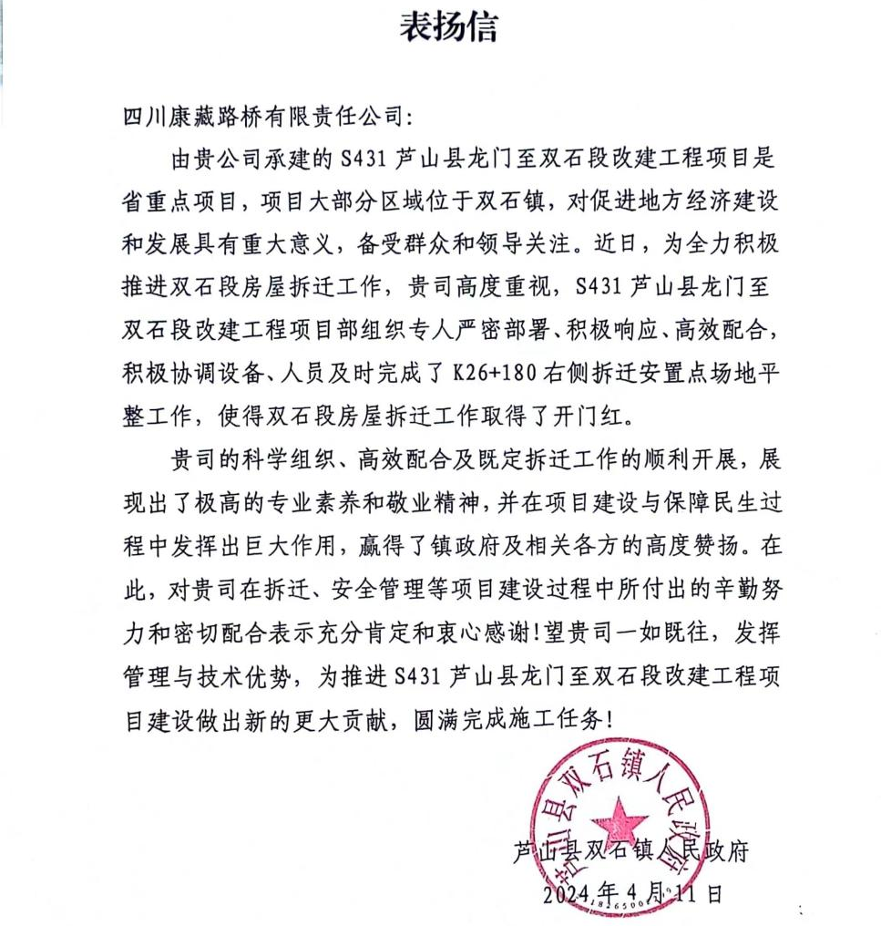 雅安交建集團(tuán)四川康藏路橋有限責(zé)任公司收到來(lái)自蘆山縣雙石鎮(zhèn)人民政府的表?yè)P(yáng)信