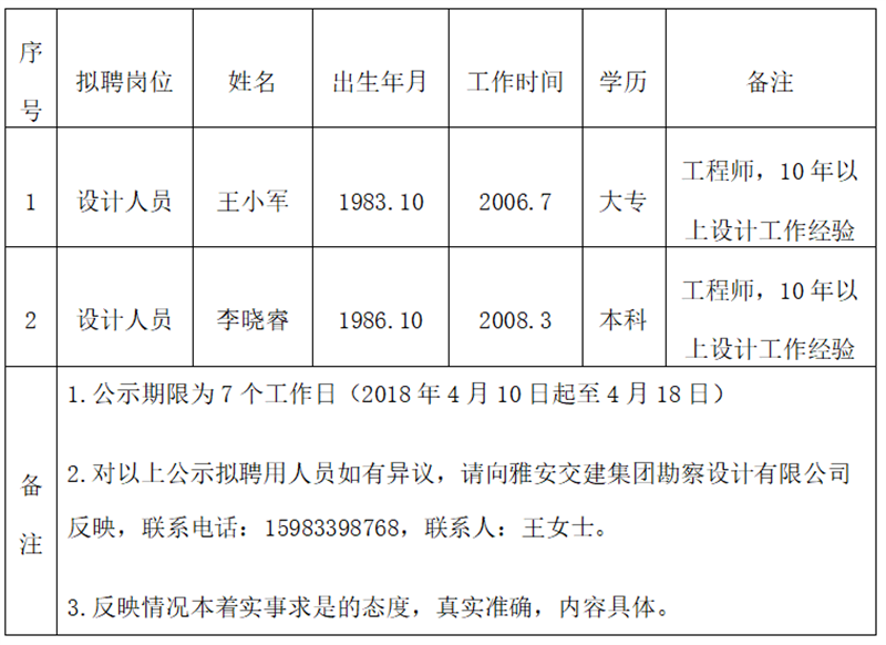 通過公開報名、資格審查、面試等程序,經雅安交建集團勘察設計有限公司研究擇優(yōu)確定以下2名擬聘用人員,現公示名單如下: