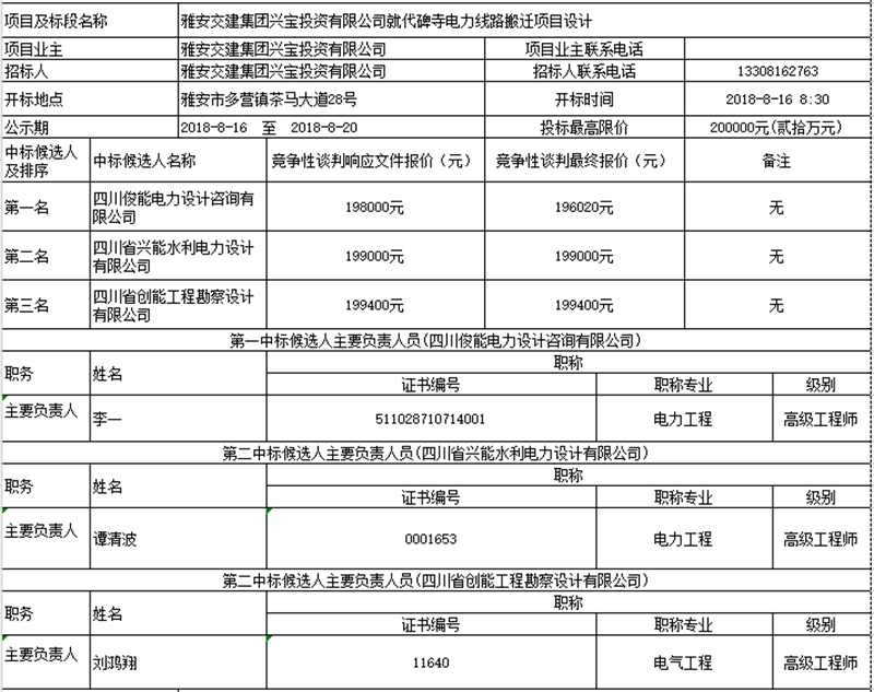 雅安交建集團興寶投資有限公司就代碑寺電力線路搬遷項目設計競爭性談判中標候選人公示