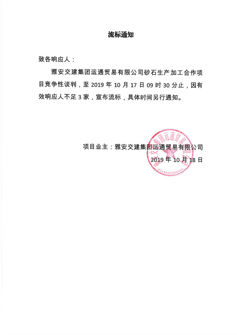 雅安交建集團運通貿(mào)易有限公司砂石生產(chǎn)加工合作項目流標通知