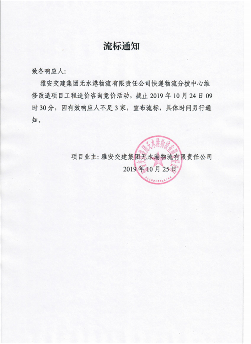 雅安交建集團(tuán)無(wú)水港物流有限責(zé)任公司快遞物流分撥中心維修改造項(xiàng)目工程造價(jià)咨詢競(jìng)價(jià)流標(biāo)通知