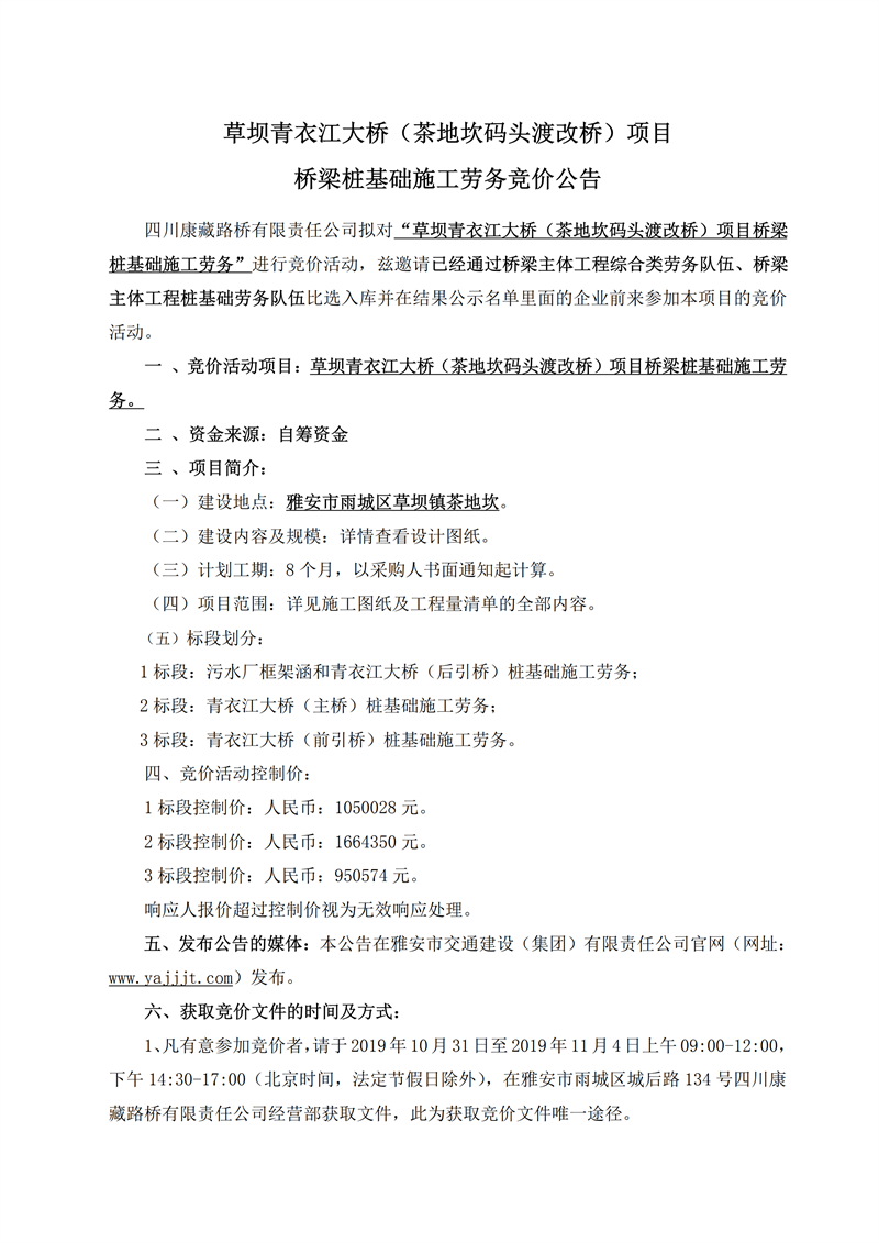 四川康藏路橋有限責(zé)任公司草壩青衣江大橋(茶地坎碼頭渡改橋)項(xiàng)目橋梁樁基礎(chǔ)施工勞務(wù)競(jìng)價(jià)公告