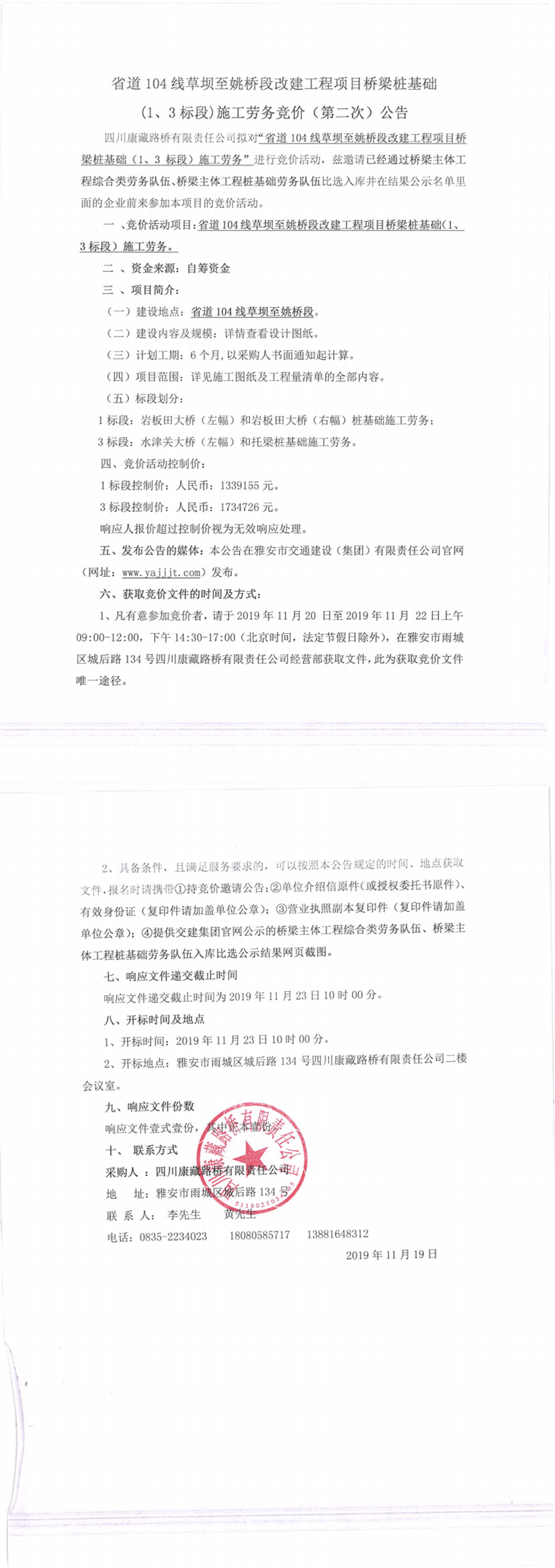 四川康藏路橋有限責任公司省道104線草壩至姚橋段改建工程項目橋梁樁基礎(1、3標段)施工勞務競價(第二次)公告