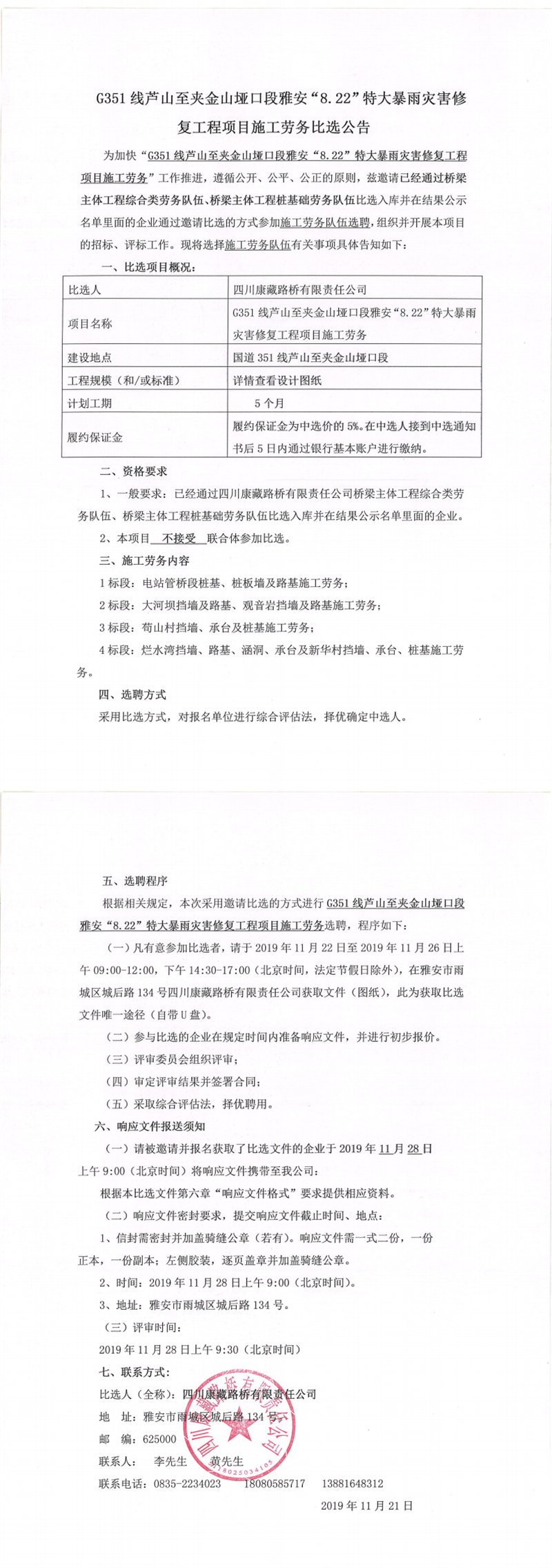 四川康藏路橋有限責任公司G351線蘆山至夾金山埡口段雅安“8.22”特大暴雨災(zāi)害修復(fù)工程項目施工勞務(wù)比選公告