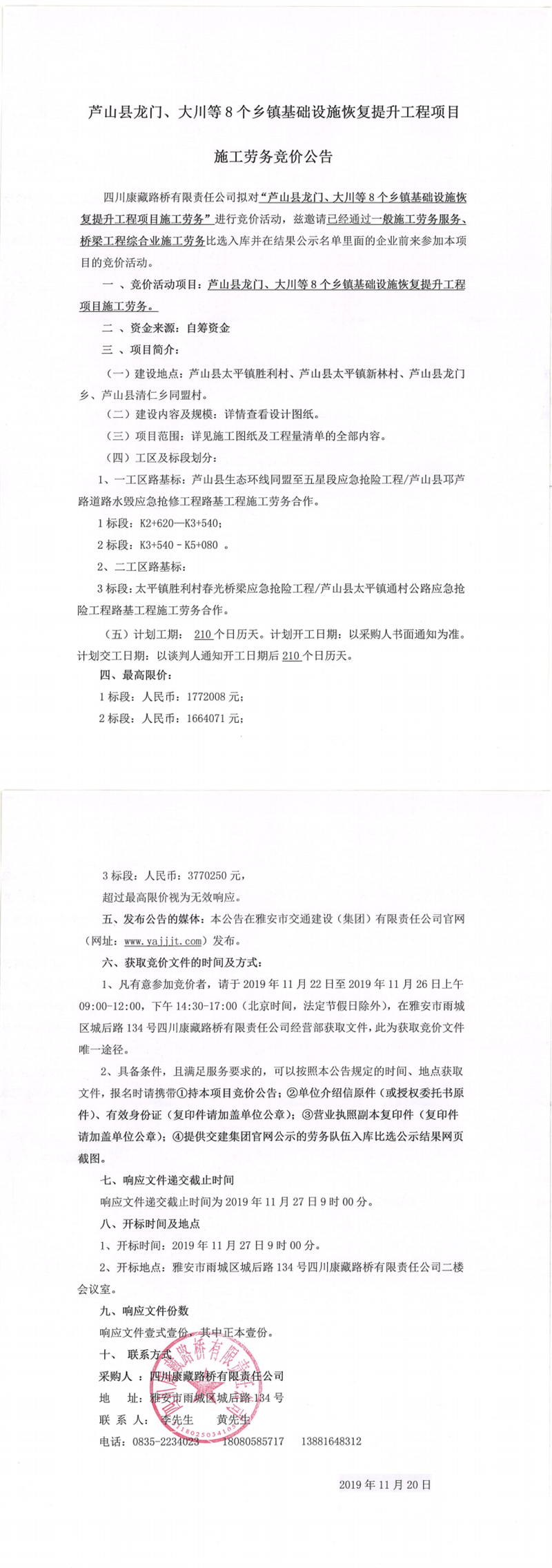 四川康藏路橋有限責(zé)任公司蘆山縣龍門(mén)、大川等8個(gè)鄉(xiāng)鎮(zhèn)基礎(chǔ)設(shè)施恢復(fù)提升工程項(xiàng)目施工勞務(wù)競(jìng)價(jià)公告