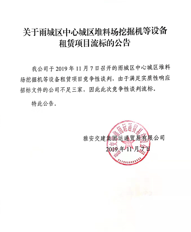 雅安交建集團運通貿(mào)易有限公司關(guān)于雨城區(qū)中心城區(qū)堆料場挖掘機等設(shè)備租賃項目流標(biāo)的公告