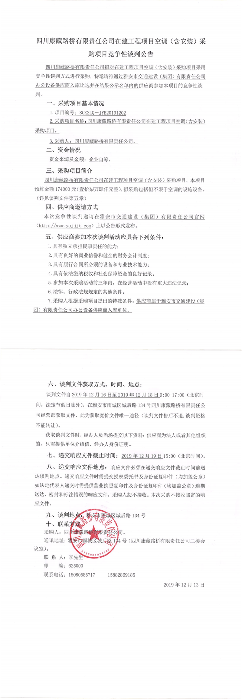 四川康藏路橋有限責(zé)任公司在建工程項(xiàng)目空調(diào)(含安裝)采購(gòu)項(xiàng)目競(jìng)爭(zhēng)性談判公告