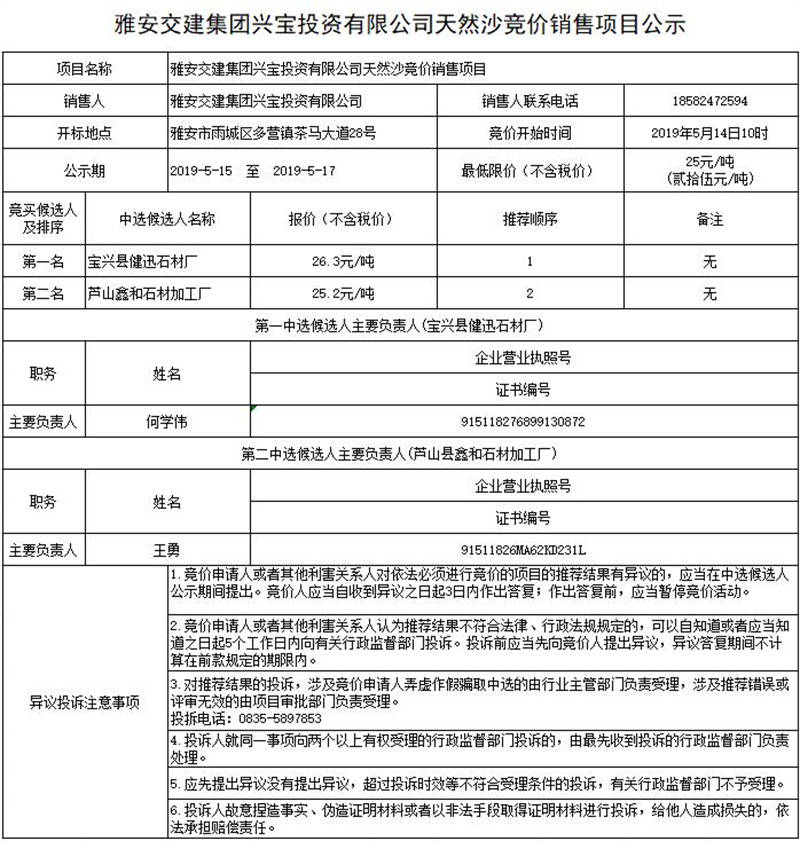 雅安交建集團(tuán)興寶投資有限公司天然沙競價銷售項目公示