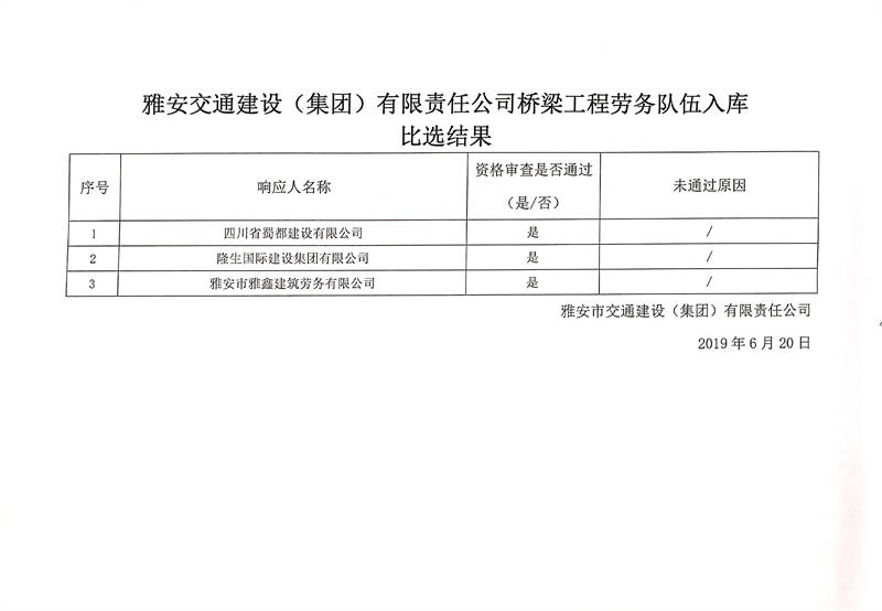 雅安交通建設(shè)(集團(tuán))有限責(zé)任公司橋梁工程勞務(wù)隊(duì)伍入庫(kù)比選結(jié)果