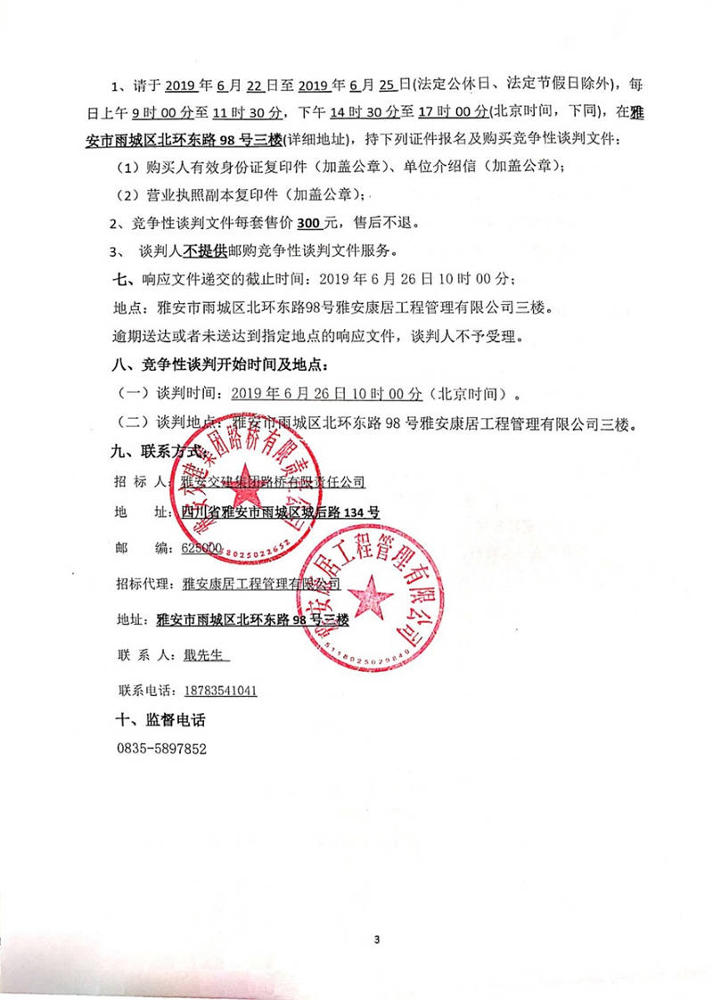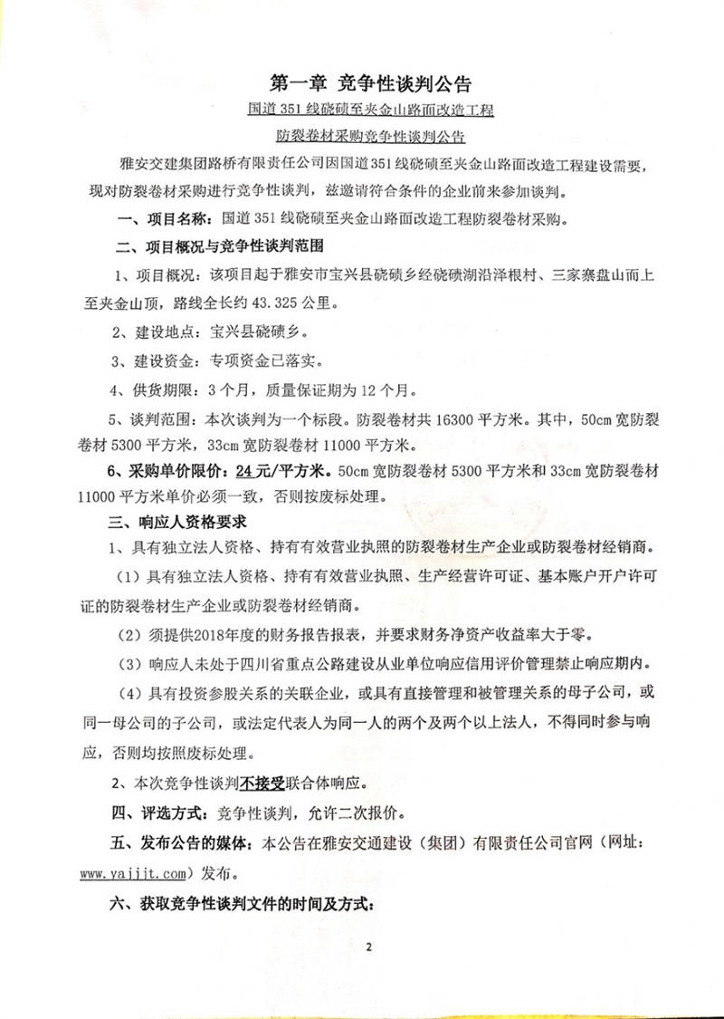 雅安交建集團路橋有限責任公司國道351線磽磧至夾金山路面改造工程防裂卷材采購競爭性談判公告