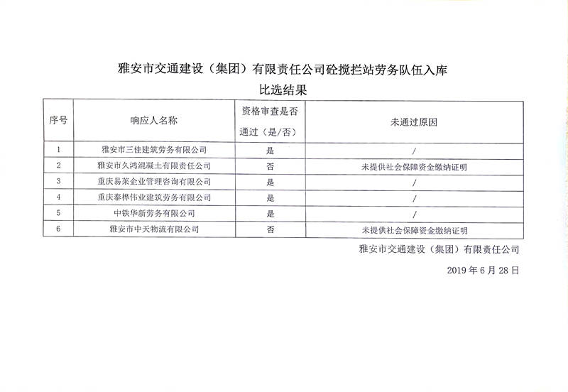 雅安市交通建設(shè)(集團(tuán))有限責(zé)任公司砼攪攔站勞務(wù)隊伍入庫比選結(jié)果