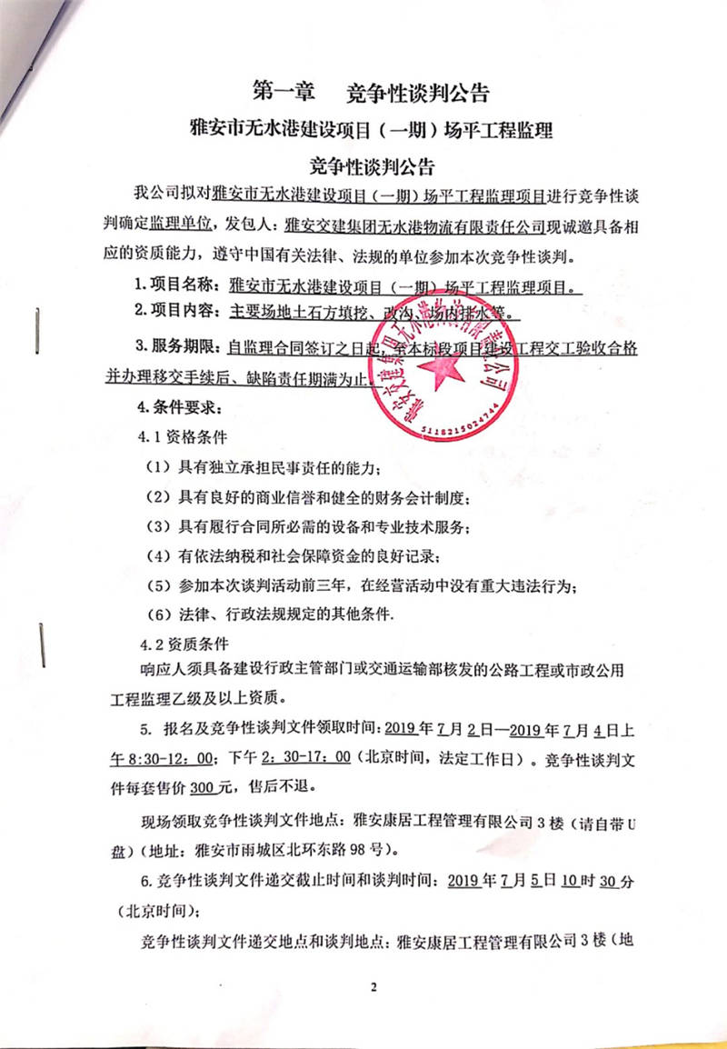 雅安交建集團(tuán)無水港物流有限責(zé)任公司雅安市無水港建設(shè)項(xiàng)目(一期)場(chǎng)平工程監(jiān)理競(jìng)爭(zhēng)性談判公告