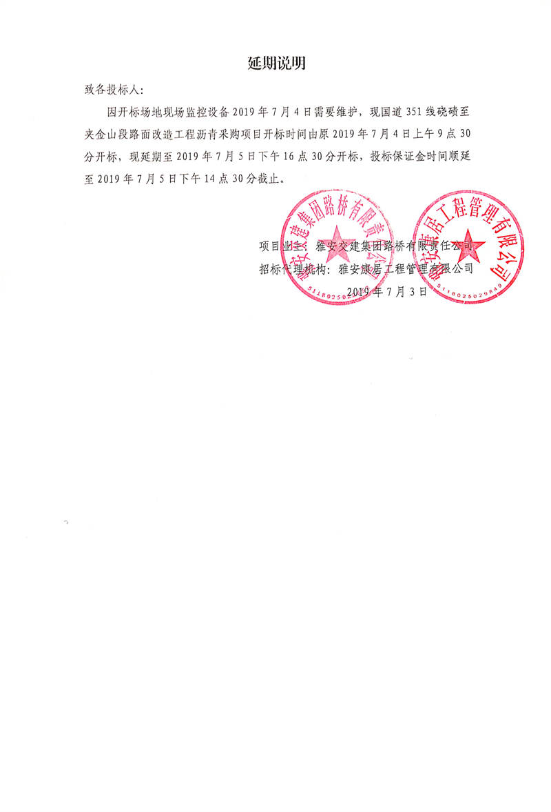 雅安交建集團(tuán)路橋有限責(zé)任公司國道351線磽磧至夾金山段路面改造工程瀝青采購招標(biāo)延期說明