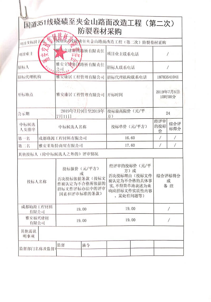 雅安交建集團路橋有限責任公司國道351線磽磧至夾金山路面改造工程(第二次)防裂卷材采購競爭性談判結果公示
