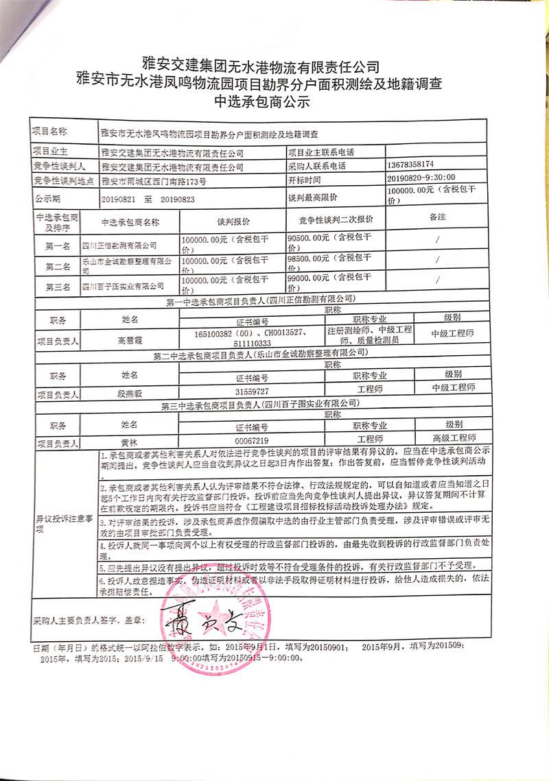 雅安交建集團無水港物流有限責(zé)任公司雅安市無水港鳳鳴物流園項目勘界分戶面積測繪及地籍調(diào)查中選承包商公示