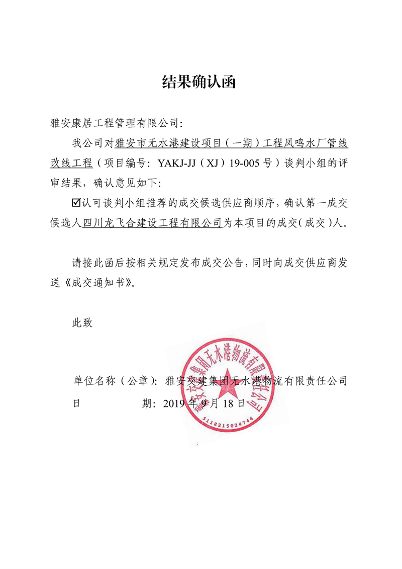 雅安交建集團(tuán)無水港物流有限責(zé)任公司雅安市無水港建設(shè)項(xiàng)目(一期)工程鳳鳴水廠管線改線工程競爭性談判結(jié)果公示