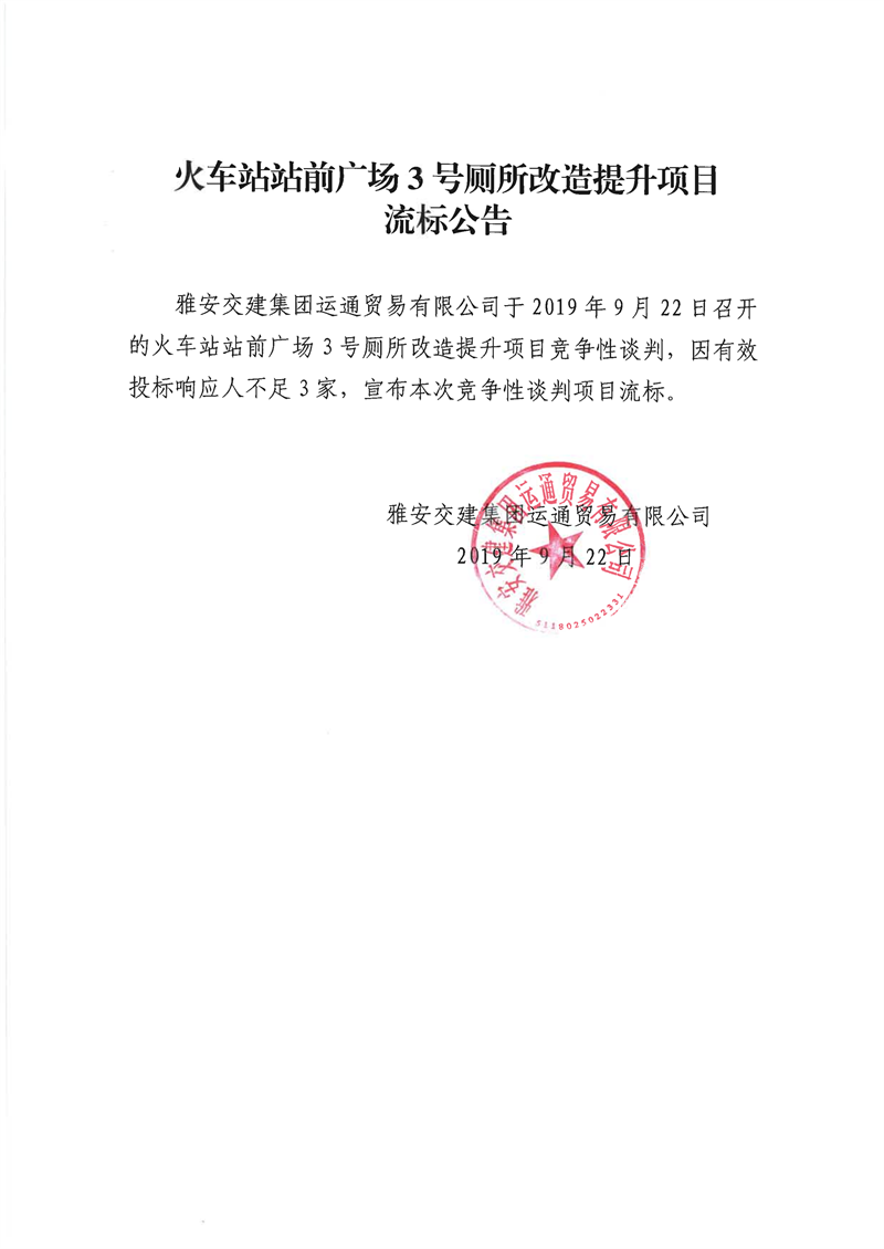 雅安交建集團(tuán)運(yùn)通貿(mào)易有限公司火車站站前廣場(chǎng)3號(hào)廁所改造提升項(xiàng)目流標(biāo)公告