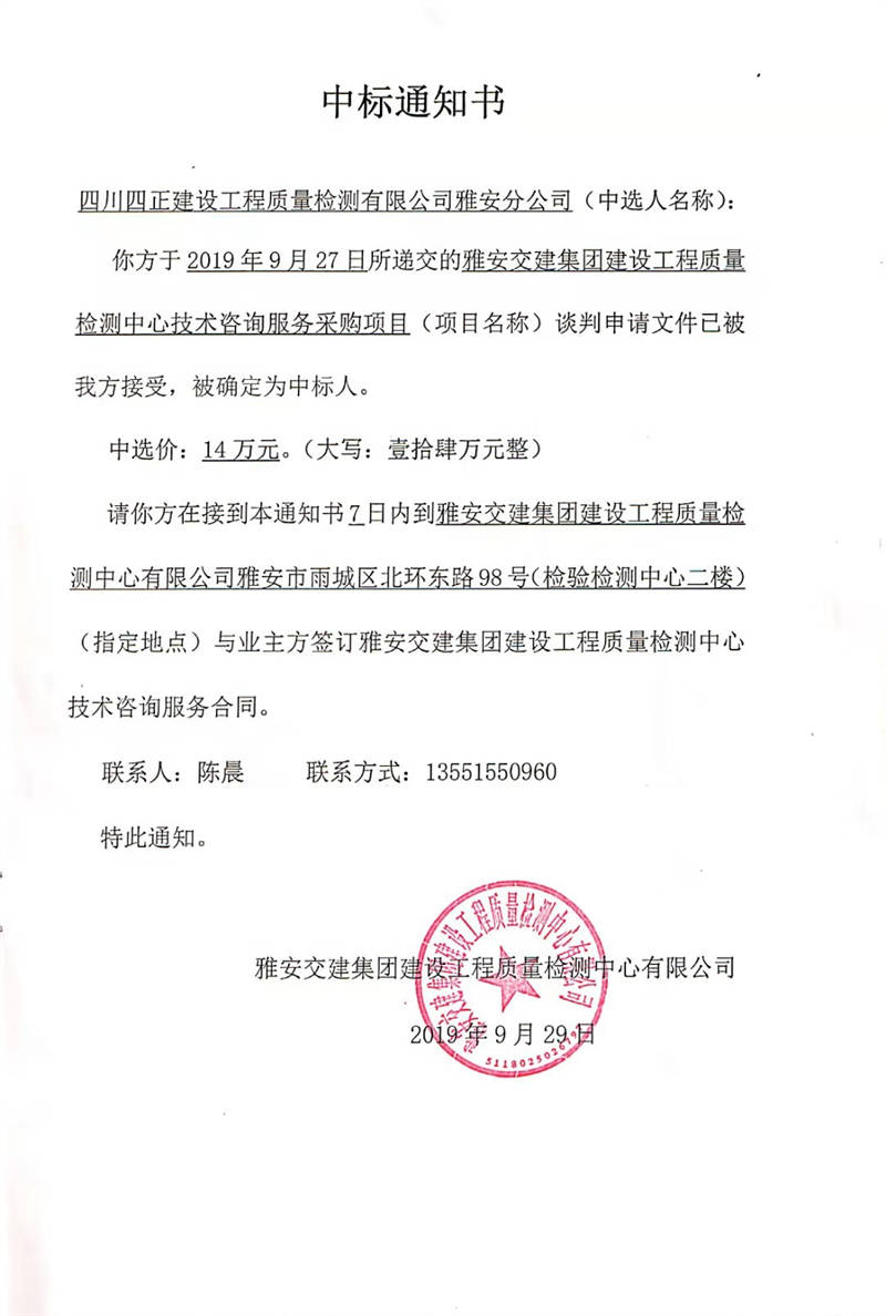 雅安交建集團(tuán)建設(shè)工程質(zhì)量檢測中心技術(shù)咨詢服務(wù)采購項(xiàng)目中標(biāo)公示