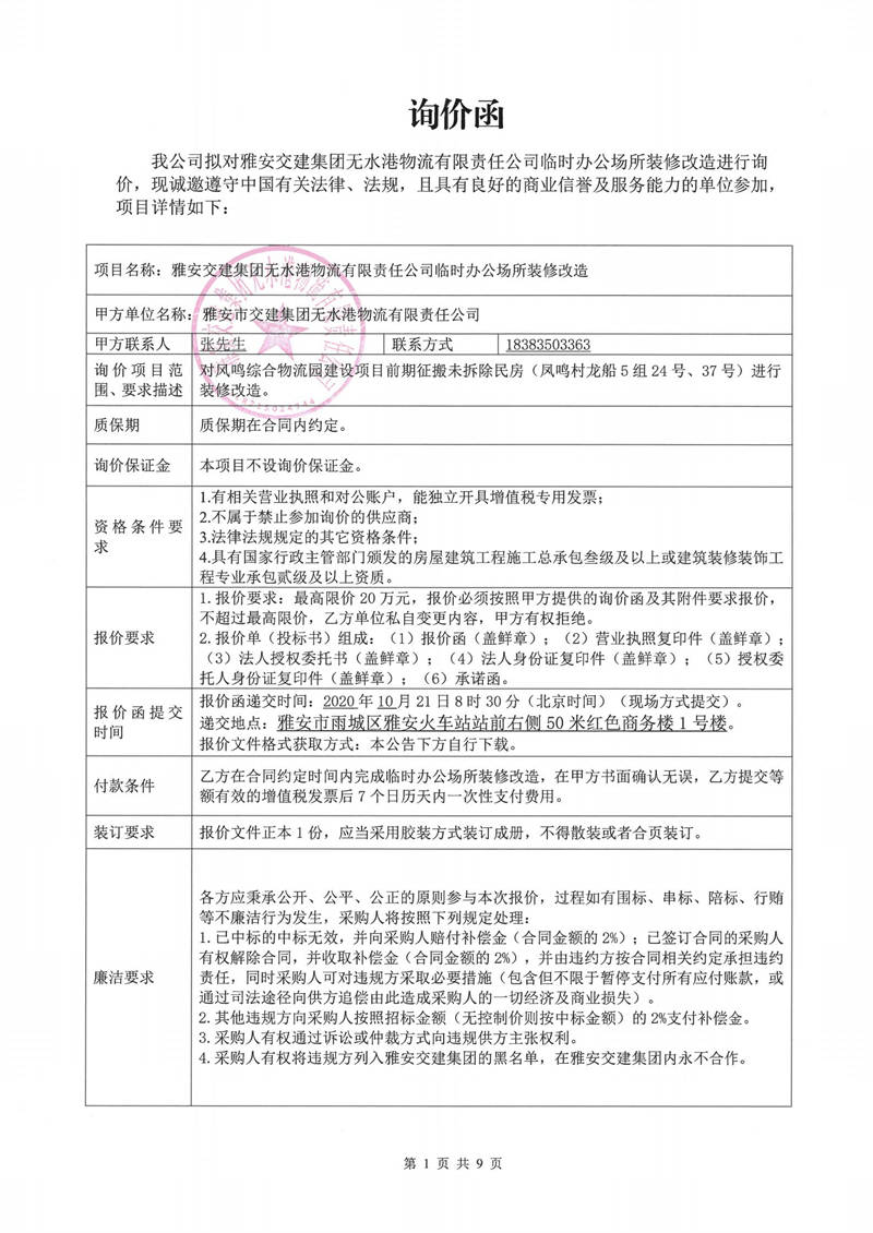 雅安交建集團(tuán)無(wú)水港物流有限責(zé)任公司臨時(shí)辦公場(chǎng)所裝修改造詢價(jià)函