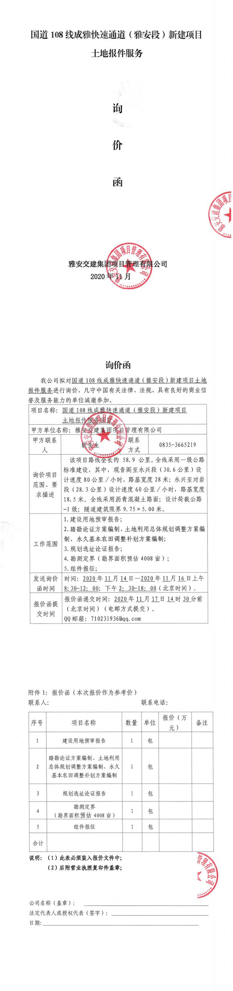 雅安交建集團項目管理有限公司國道108線成雅快速通道(雅安段)新建項目土地報件服務(wù)項目詢價函