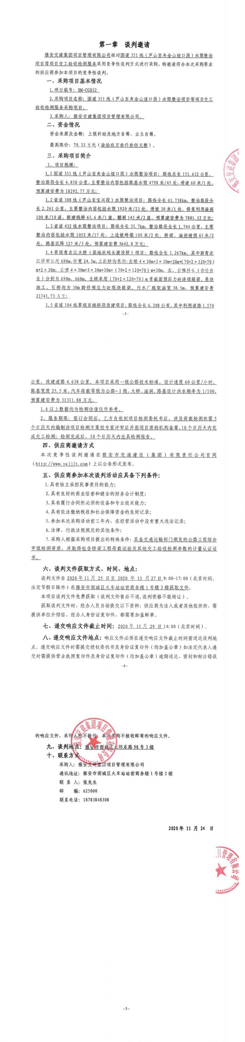 雅安交建集團(tuán)項(xiàng)目管理有限公司國(guó)道351線(蘆山至夾金山埡口段)水毀整治項(xiàng)目等項(xiàng)目交工驗(yàn)收檢測(cè)服務(wù)采購(gòu)項(xiàng)目競(jìng)爭(zhēng)性談判公告