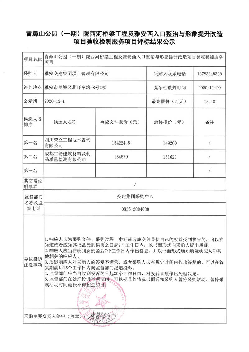 雅安交建集團項目管理有限公司青鼻山公園(一期)隴西河橋梁工程及雅安西入口整治與形象提升改造項目驗收檢測服務項目評標結(jié)果公示
