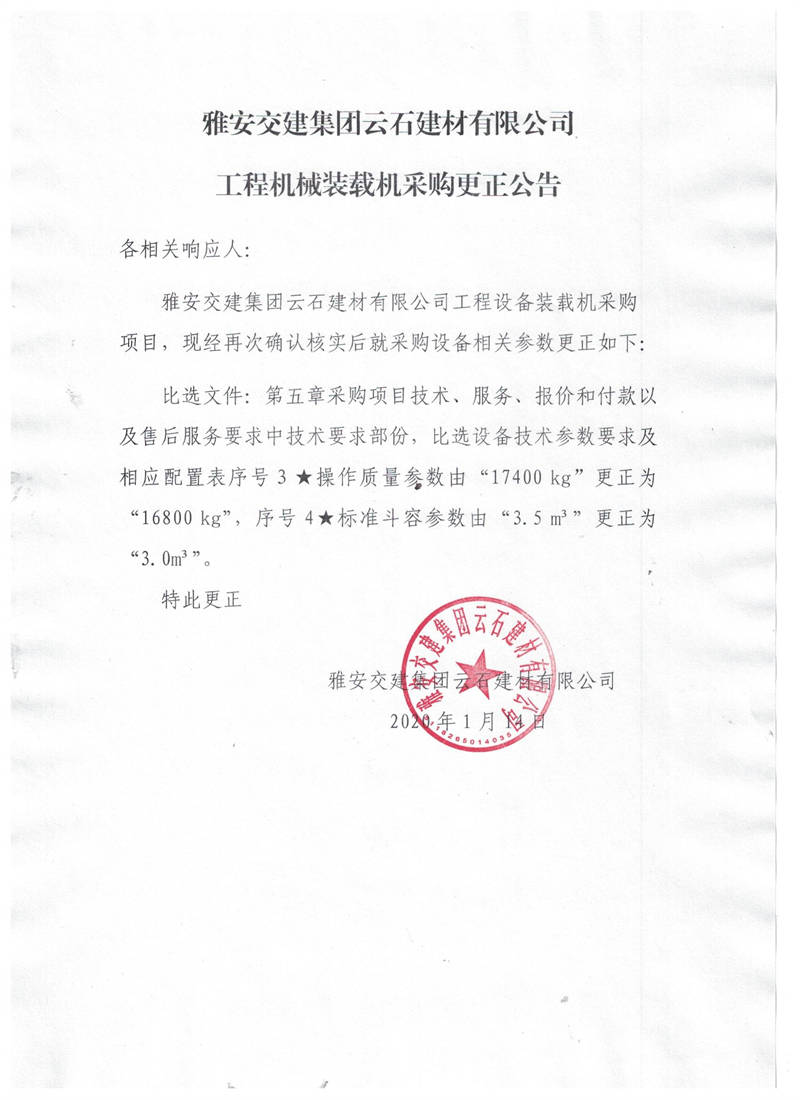 雅安交建集團(tuán)云石建材有限公司工程機械裝載機采購更正公告