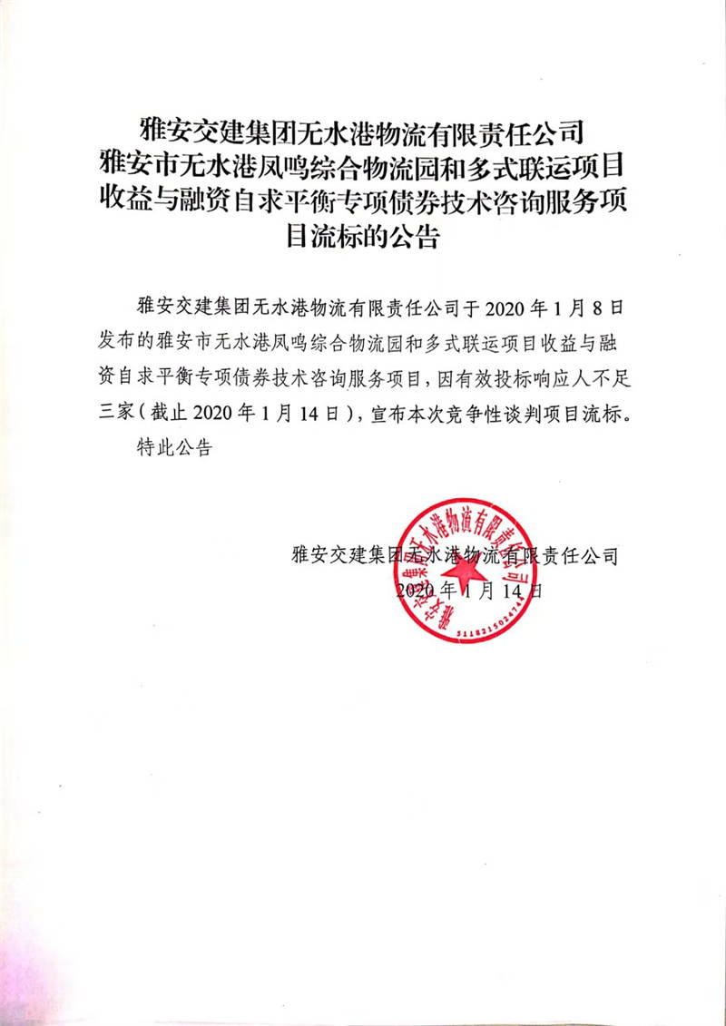 雅安交建集團無水港物流有限責任公司雅安市無水港鳳鳴綜合物流園和多式聯(lián)運項目收益與融資自求平衡專項債券技術(shù)咨詢服務(wù)項目流標的公告