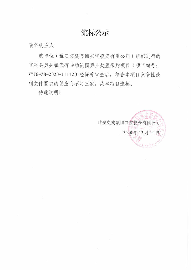 雅安交建集團(tuán)興寶投資有限公司寶興縣靈關(guān)鎮(zhèn)代碑寺物流園棄土處置采購(gòu)項(xiàng)目流標(biāo)公示