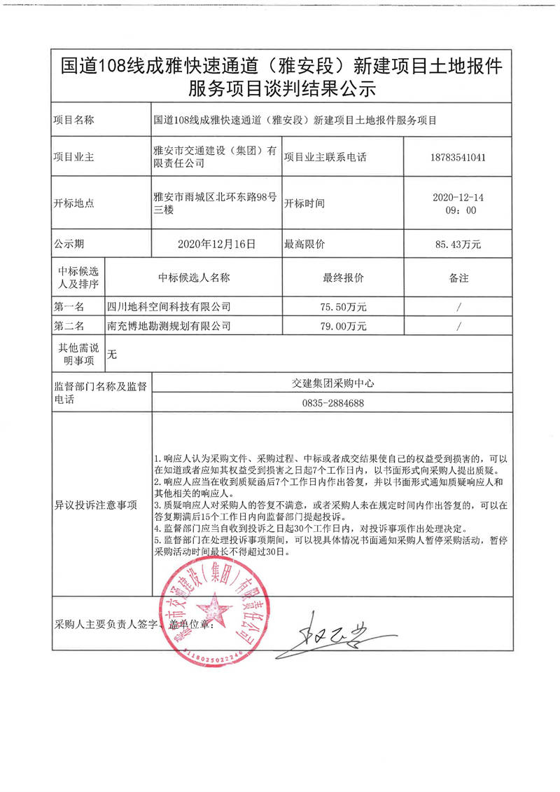 雅安市交通建設(shè)(集團(tuán))有限責(zé)任公司國(guó)道108線成雅快速通道(雅安段)新建項(xiàng)目土地報(bào)件服務(wù)項(xiàng)目談判結(jié)果公示