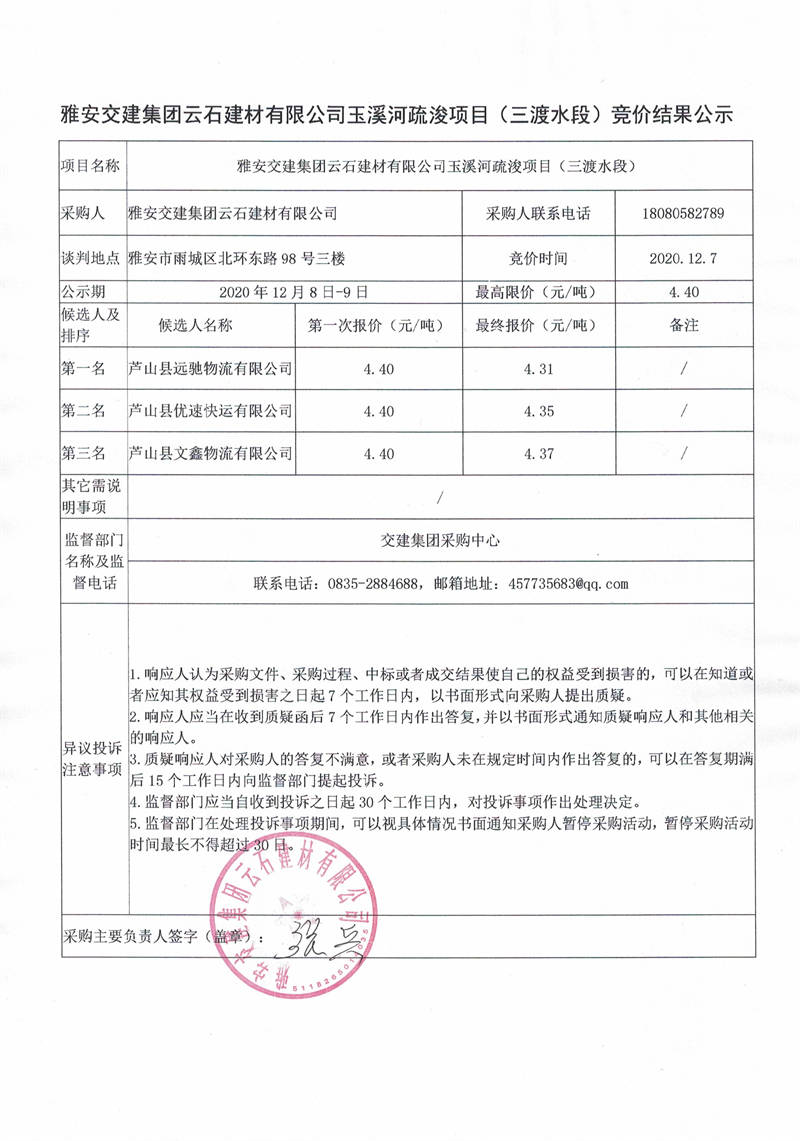 雅安交建集團(tuán)云石建材有限公司玉溪河疏浚項(xiàng)目(三渡水段)競價結(jié)果公示