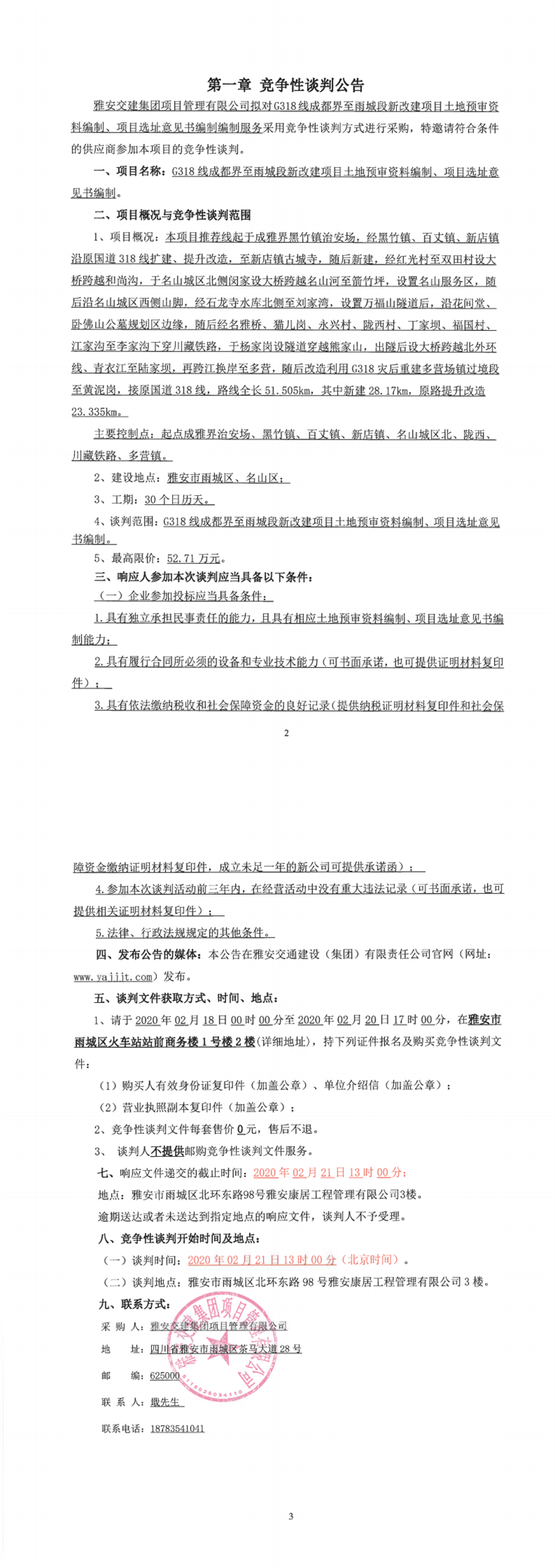 雅安交建集團(tuán)項目管理有限公司G318線成都界至雨城段新改建項目土地預(yù)審資料編制、項目選址意見書編制競爭性談判公告