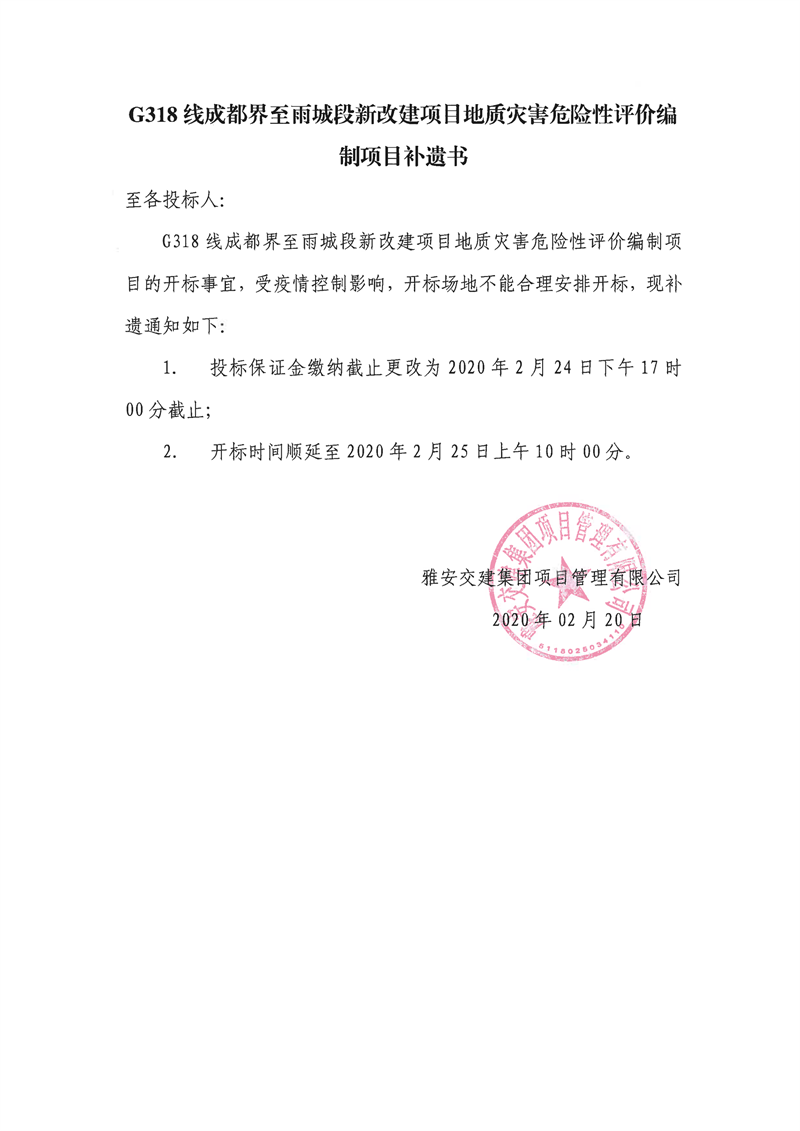 雅安交建集團項目管理有限公司G318線成都界至雨城段新改建項目地質(zhì)災(zāi)害危險性評價編制項目補遺書