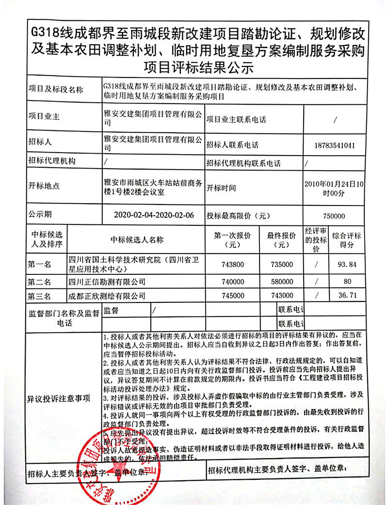 雅安交建集團項目管理有限公司G318線成都界至雨城段新改建項目踏勘論證、規(guī)劃修改及基本農(nóng)田調(diào)整補劃、臨時用地復墾方案編制服務采購項目評標結(jié)果公示