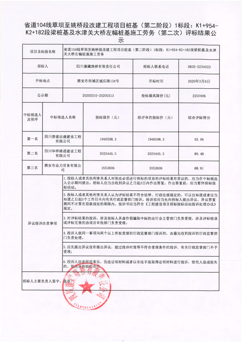 四川康藏路橋有限責任公司省道104線草壩至姚橋段改建工程項目樁基(第二階段)1標段:K1+954-K2+182段梁樁基及水津關大橋左幅樁基施工勞務(第二次)評標結果公示