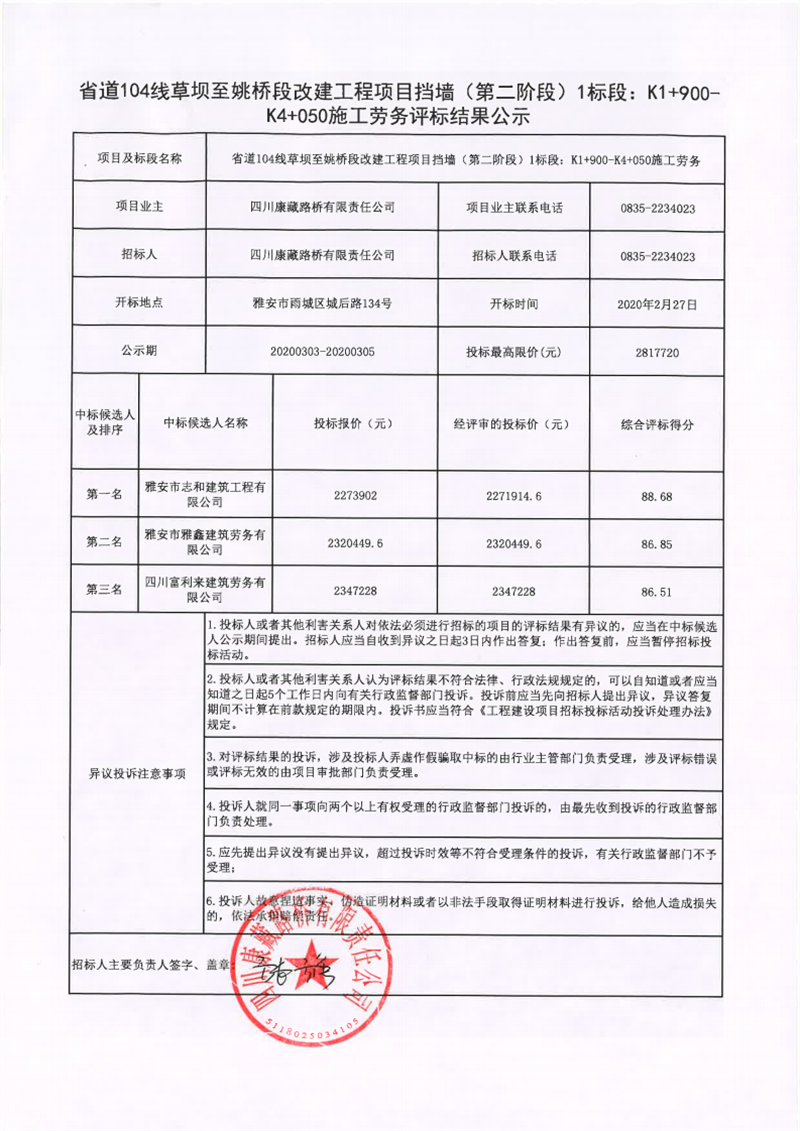 四川康藏路橋有限責(zé)任公司省道104線草壩至姚橋段改建工程項目擋墻(第二階段)1標(biāo)段:K1+900-K4+050施工勞務(wù)評標(biāo)結(jié)果公示