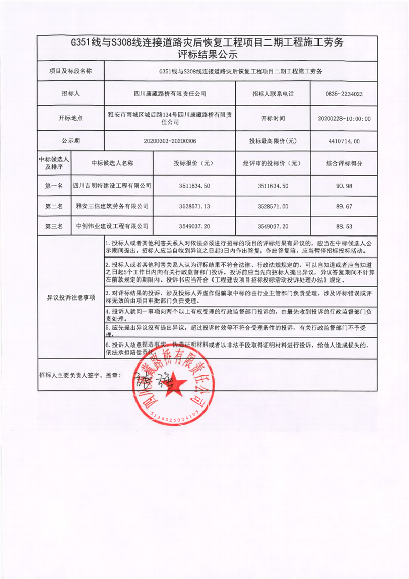 四川康藏路橋有限責任公司G351線與S308線連接道路災(zāi)后恢復工程項目二期工程施工勞務(wù)評標結(jié)果公示