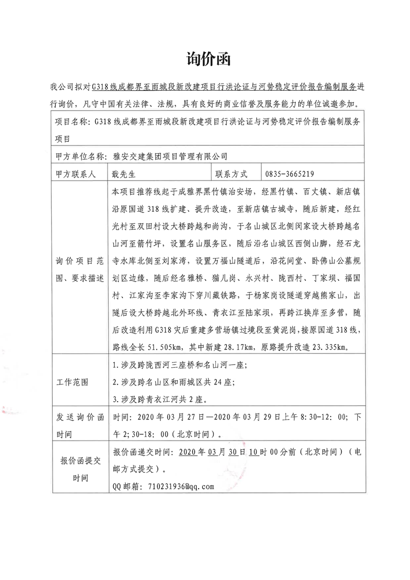 雅安交建集團(tuán)項(xiàng)目管理有限公司G318線(xiàn)成都界至雨城段新改建項(xiàng)目行洪論證與河勢(shì)穩(wěn)定評(píng)價(jià)報(bào)告編制服務(wù)項(xiàng)目詢(xún)價(jià)函