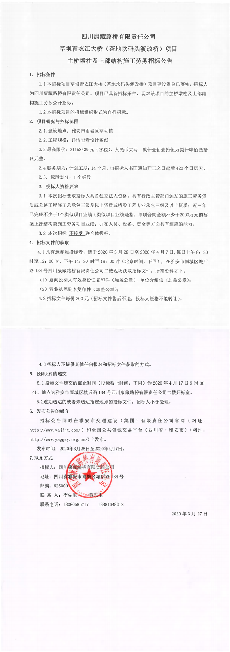 四川康藏路橋有限責(zé)任公司草壩青衣江大橋(茶地坎碼頭渡改橋)項目主橋墩柱及上部結(jié)構(gòu)施工勞務(wù)招標公告