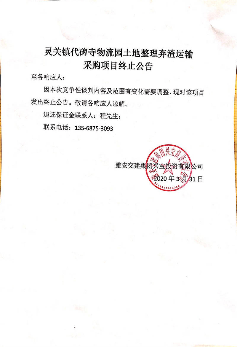 雅安交建集團(tuán)興寶投資有限公司靈關(guān)鎮(zhèn)代碑寺物流園土地整理?xiàng)壴\(yùn)輸采購(gòu)項(xiàng)目終止公告