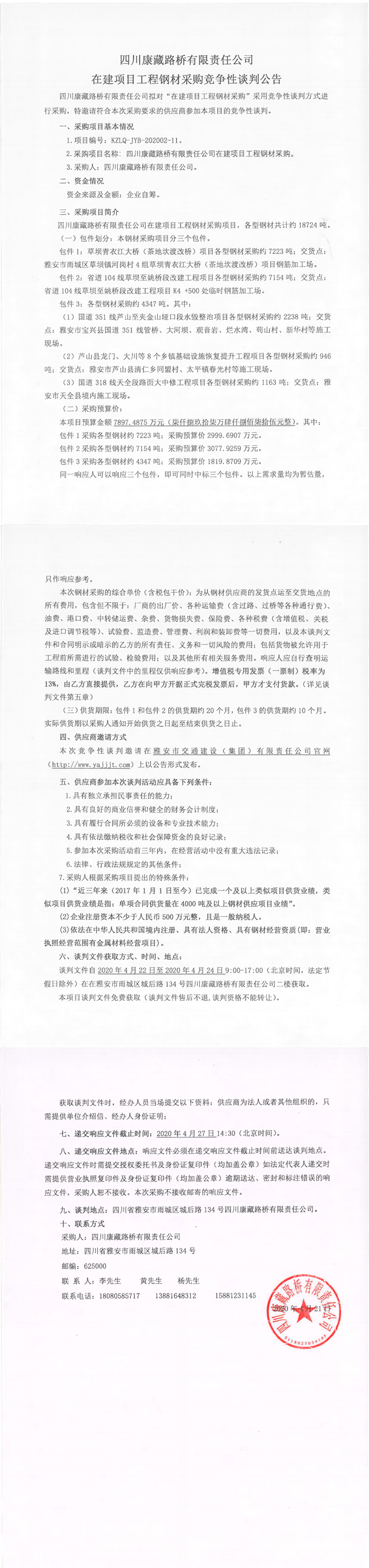 四川康藏路橋有限責(zé)任公司在建項(xiàng)目工程鋼材采購競爭性談判公告