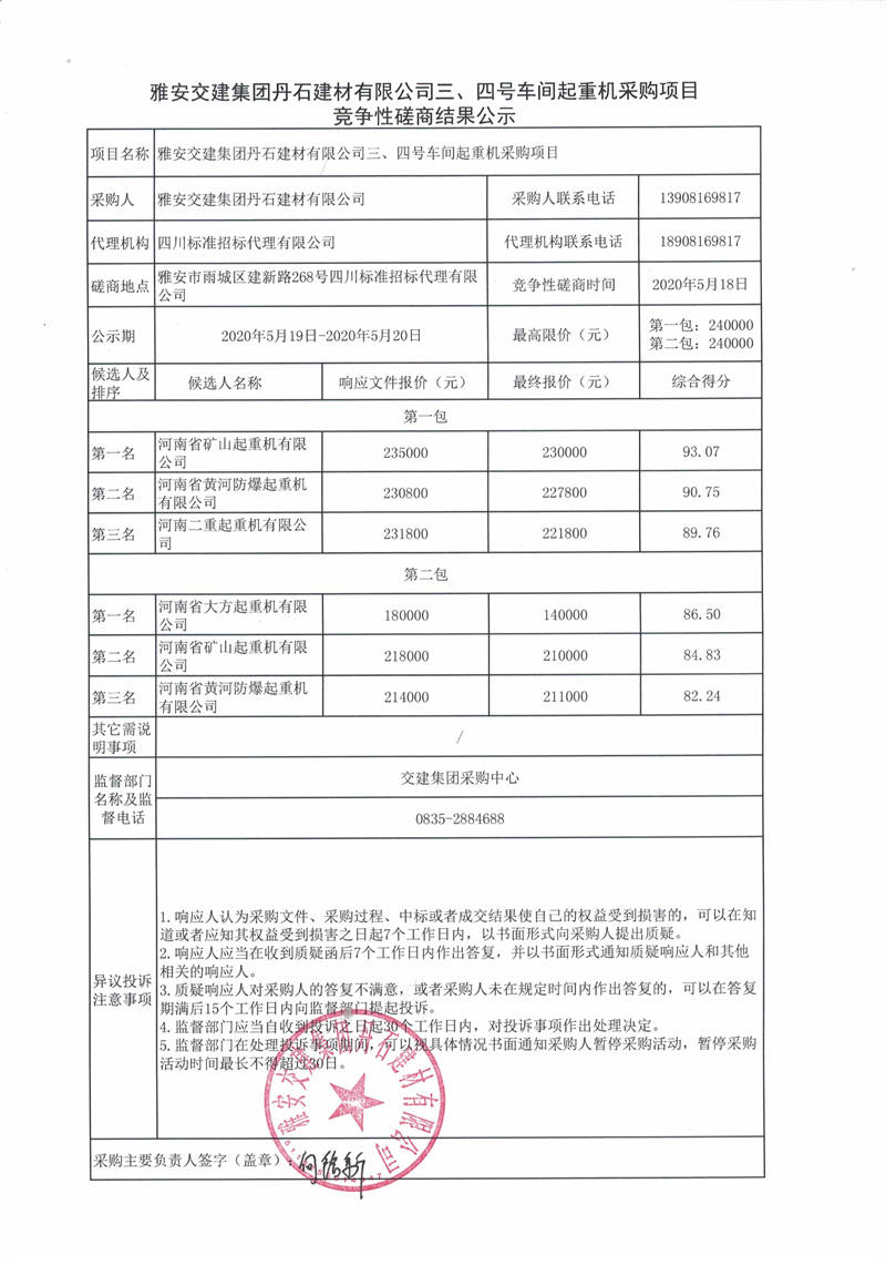 雅安交建集團丹石建材有限公司三、四號車間起重機采購項目競爭性磋商結(jié)果公示