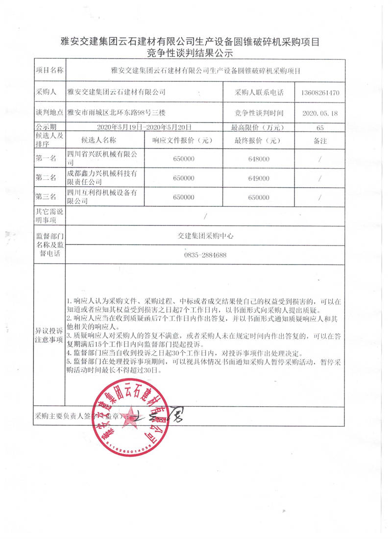 雅安交建集團云石建材有限公司生產(chǎn)設(shè)備圓錐破碎機采購項目競爭性談判結(jié)果公示