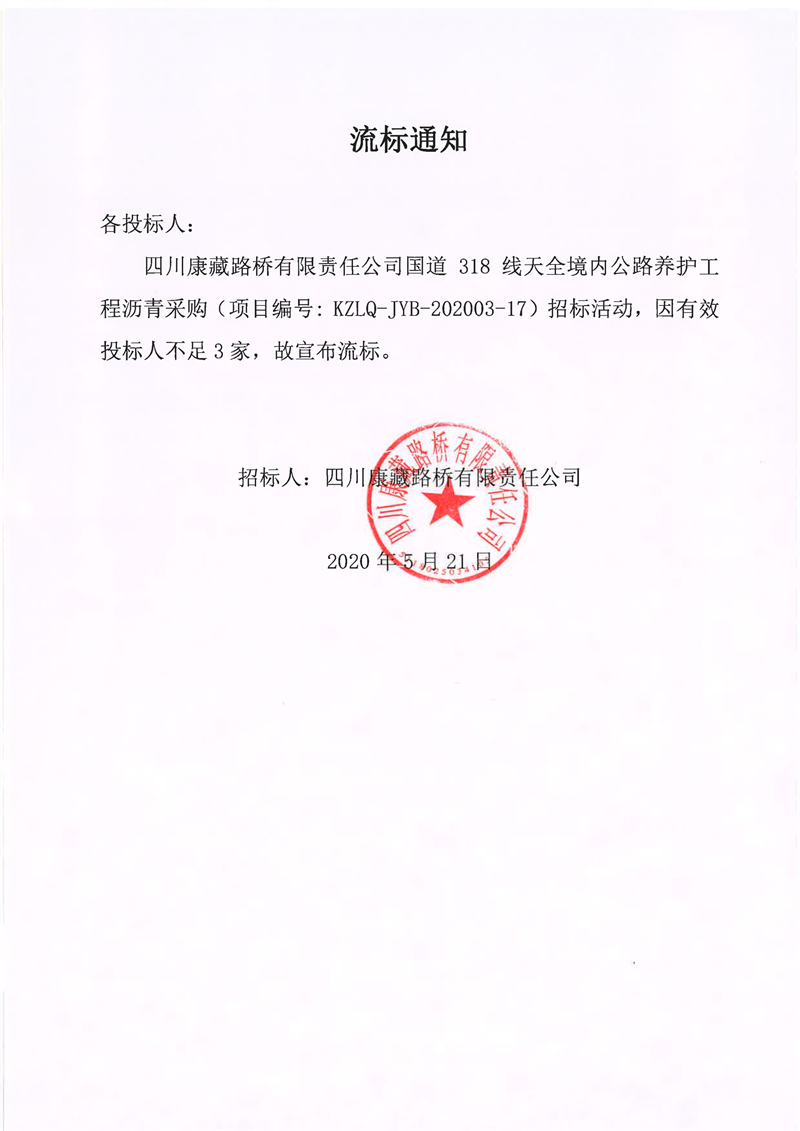 四川康藏路橋有限責(zé)任公司國(guó)道318線天全境內(nèi)公路養(yǎng)護(hù)工程瀝青采購(gòu)項(xiàng)目流標(biāo)通知