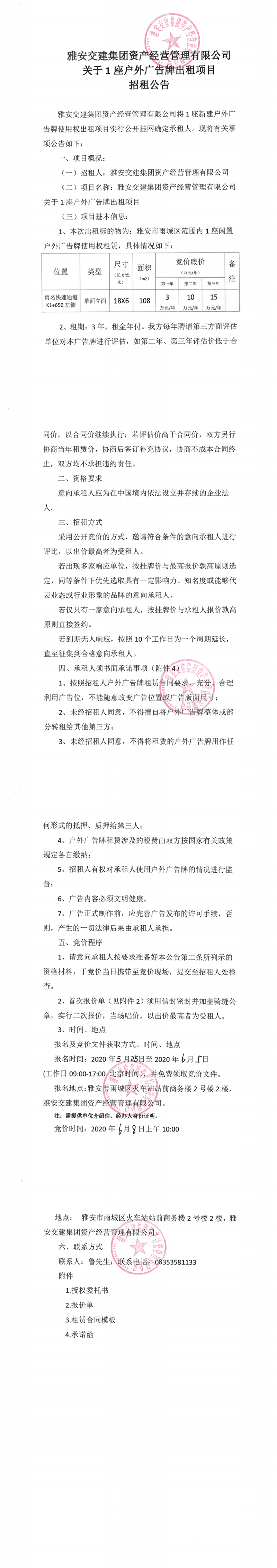雅安交建集團資產經營管理有限公司關于1座戶外廣告牌出租項目招租公告