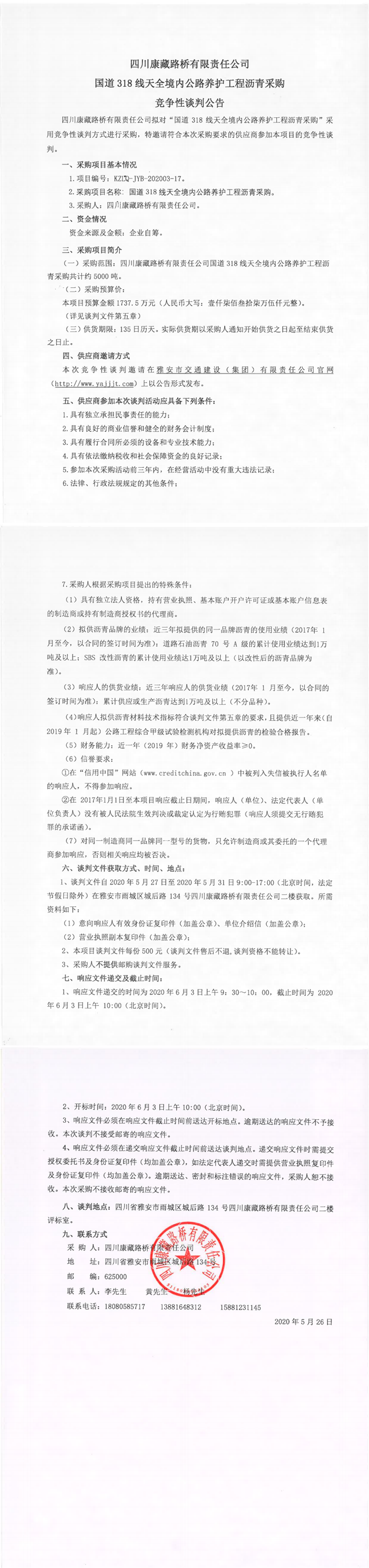 四川康藏路橋有限責任公司國道318線天全境內(nèi)公路養(yǎng)護工程瀝青采購競爭性談判公告