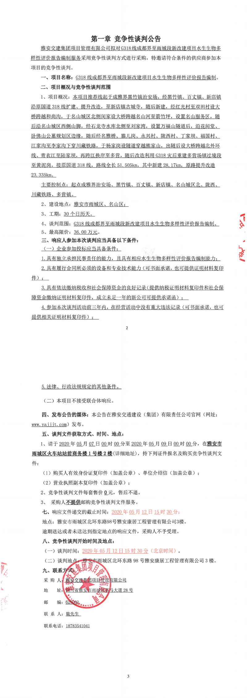 雅安交建集團項目管理有限公司G318線成都界至雨城段新改建項目水生生物多樣性評價報告編制競爭性談判(第二次)公告