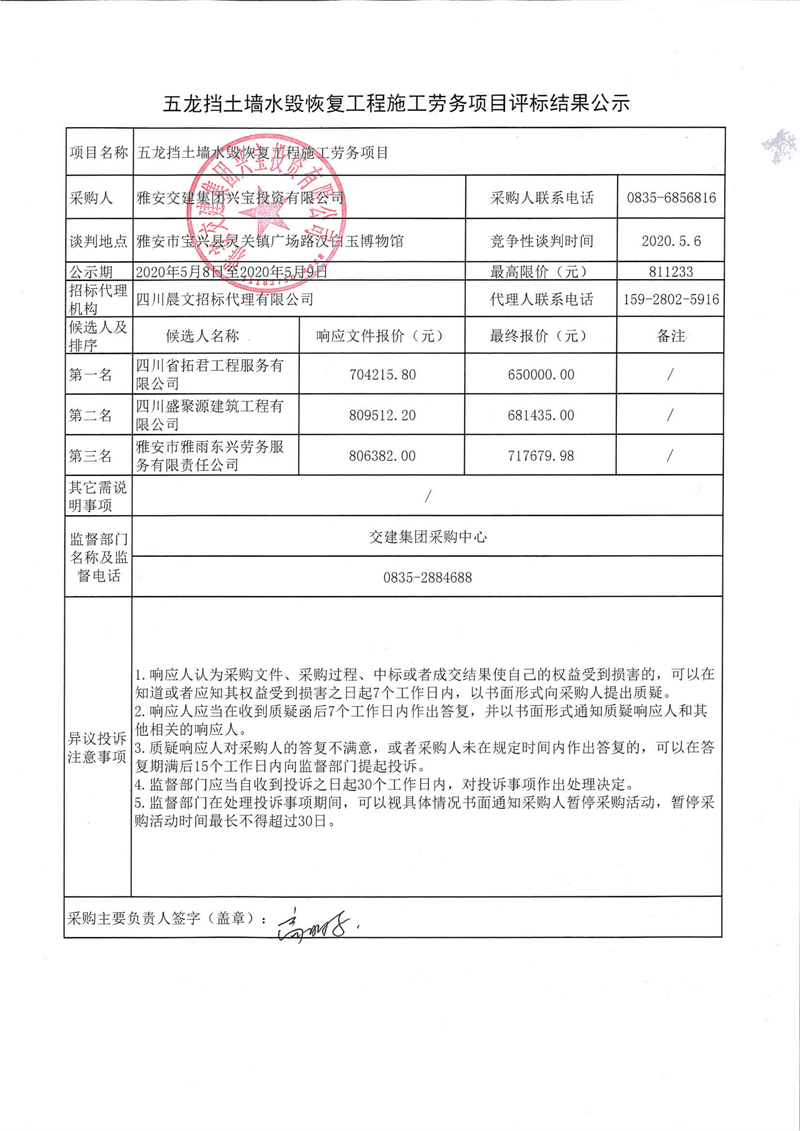 雅安交建集團(tuán)興寶投資有限公司五龍擋土墻水毀恢復(fù)工程施工勞務(wù)項目評標(biāo)結(jié)果公示